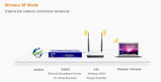 The Tenda A30 is a 300Mbps Wireless N Range Extender which is designed to extend the coverage and improve the signal strength of an existing wireless network. Combined with leading wireless N technologies, superior security and backward compatibility with wireless b/g, the A30 makes it a secure high speed solution that can help you keep an existing wireless network unchanged and vastly improve the network's coverage, giving you the freedom to roam anywhere in the house and access Internet without worrying about coverage.